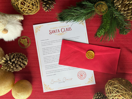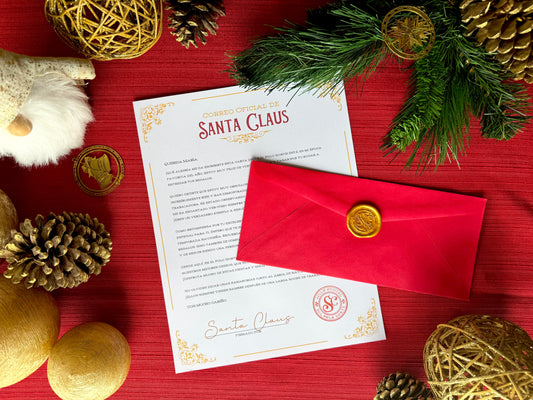 Cada carta llega sellada con cera dorada ✨, el toque mágico y auténtico de Santa Claus.